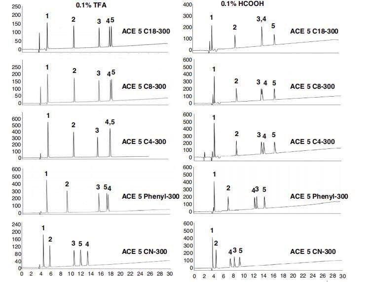 4,對于色譜柱固定相的選擇方面,ACT公司推出了生物分析方法開發(fā)包,主要提供三種固定相,C18-300, C4-300,Phenyl-300,提供三種不同的分離選擇性作為主流用柱。