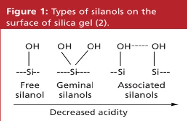 殘余的硅羥基存在于所有的硅膠鍵合相的表面。由于是弱酸的特性,這些硅羥基會同某些分析物相互作用,尤其是同一些堿性化合物。因?yàn)楣枇u基的Pka值大約是在4.5左右。