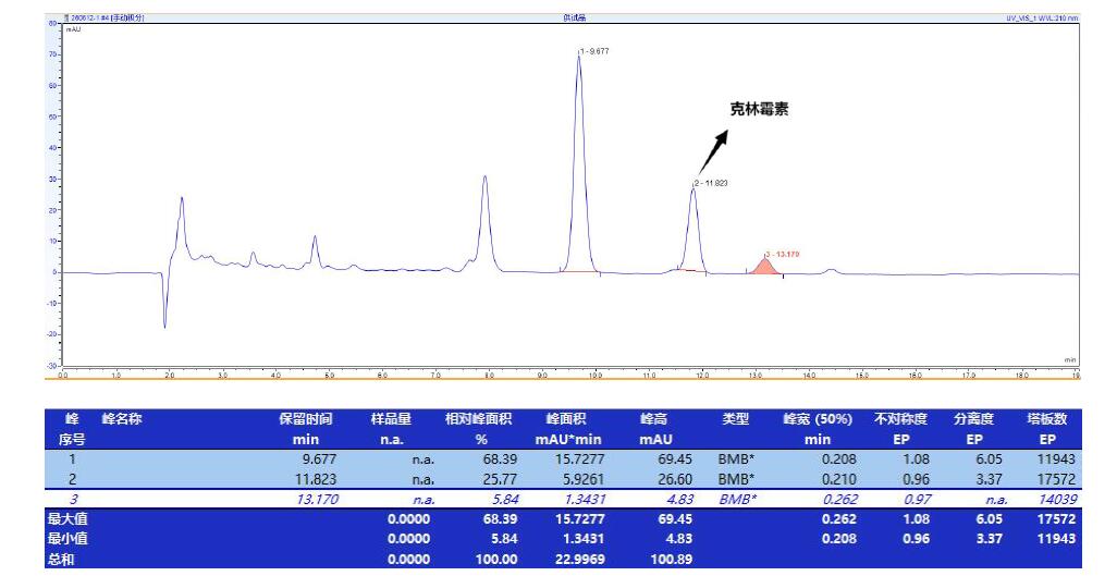 App ID: FLM-T250004 Titank C18 Plus 柱對克林霉素的檢測 色譜柱:Titank C18 Plus 5μ 250*4.6mm(貨號:FMG-0060-EONU) 流速:1 mL/min 檢測:UV210nm 柱溫:40oC 樣品濃度:1 mg/mL 進樣量:20 μ 溶劑:N/A 流動相:磷酸二氫鉀溶液(每1mL 中含磷酸二氫鉀6.8mg,用25%的氫氧化鉀溶液調節 pH 值至7.5)-乙腈(55:45) 色譜圖:
