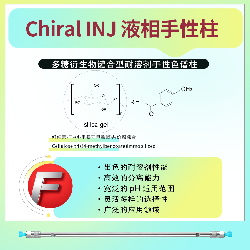 Chiral INJ 鍵合型耐溶劑手性柱的固定相為纖維素-三-(4-甲基苯甲酸酯)共價鍵鍵合(Cellulose tris(4-methylbenzoate)immobilized)。這種設(shè)計使得該手性柱具有出色的手性識別能力和耐溶劑性,能夠在廣泛的溶解條件下使用,包括各種互溶的溶劑作為流動相、溶解樣品以及手性柱再生。