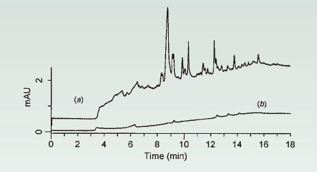 圖12. 運(yùn)行空白梯度:(a)A容器受到污染的水(A容器中溶劑有雜質(zhì))和(b)A容器中純度較高的水。色譜柱:150x4.6mm C18;1.5mL/min;35℃;在255 nm處進(jìn)行UV檢測。梯度:0-83%ACN /水運(yùn)行13分鐘,并保持5分鐘。來源[7]。